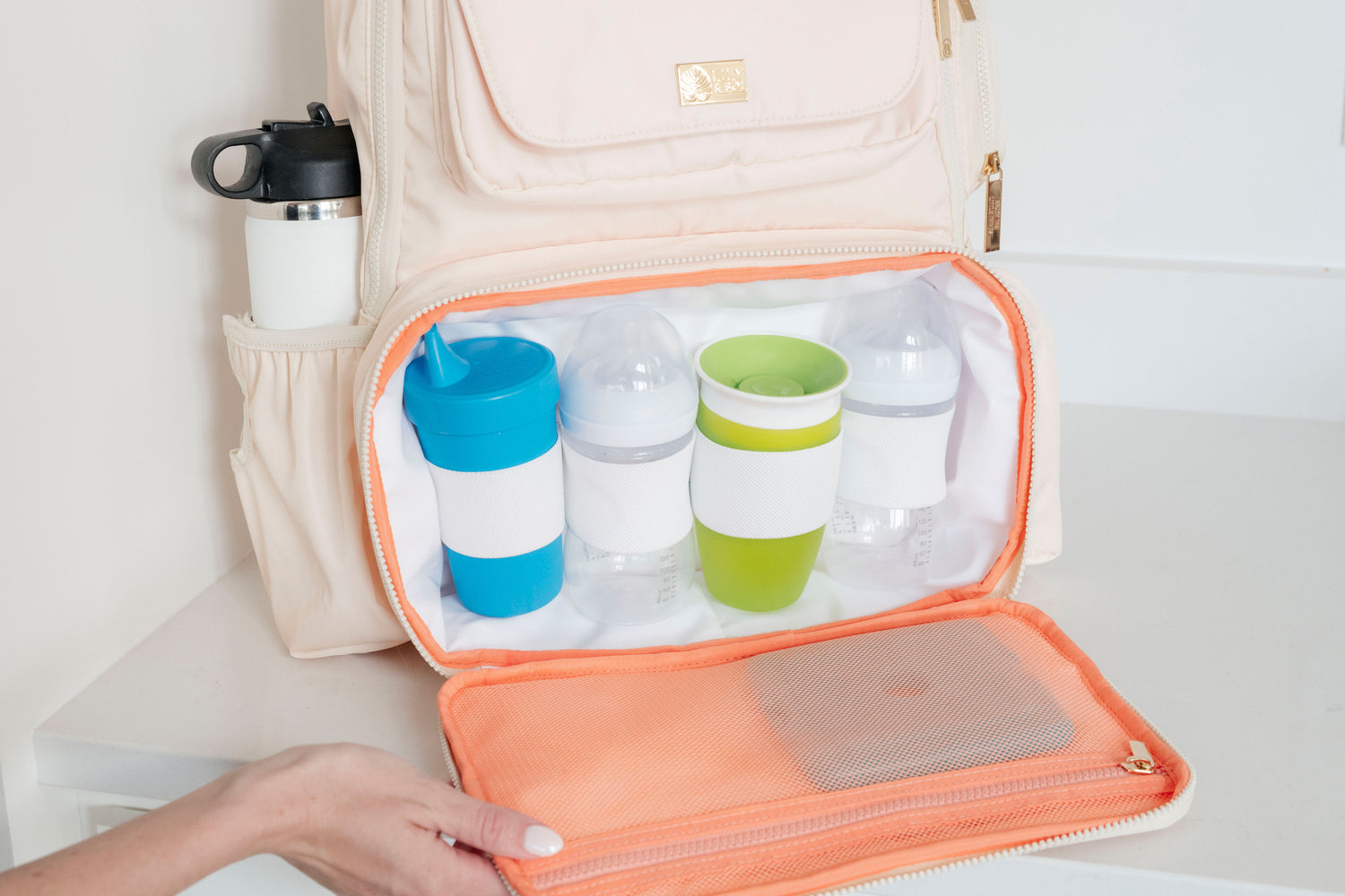 Most diaper bags come with an insulated bottle pocket or two. But what do you do when you're out for the whole day with the little ones, or you're traveling for hours? This large cooler compartment is built right into your diaper backpack! It accommodates a wide variety of bottle shapes and sizes and includes elastic bands to help keep bottles in place.